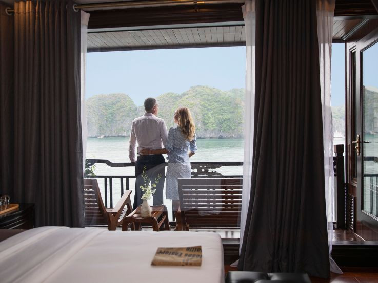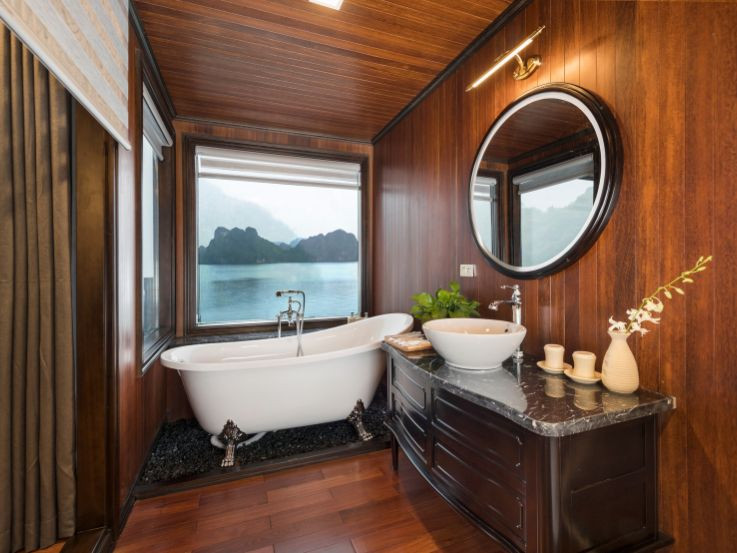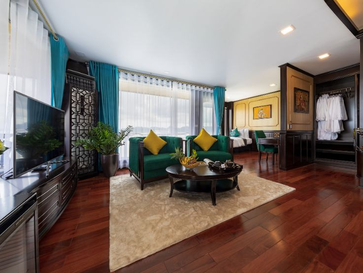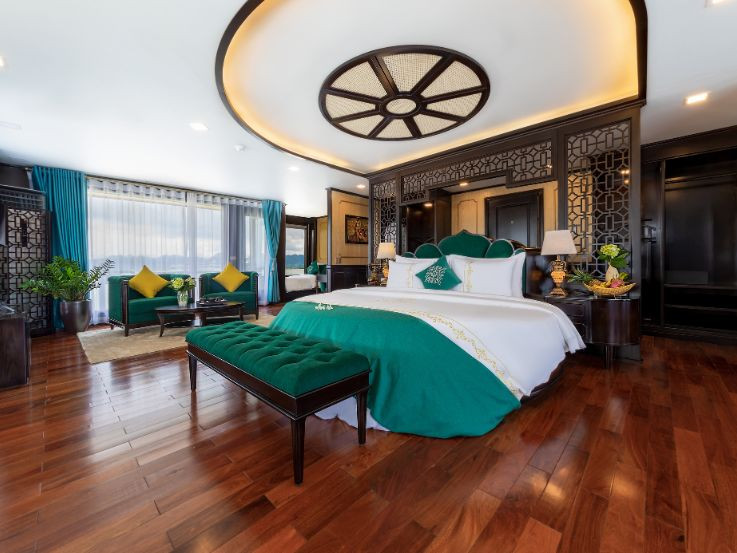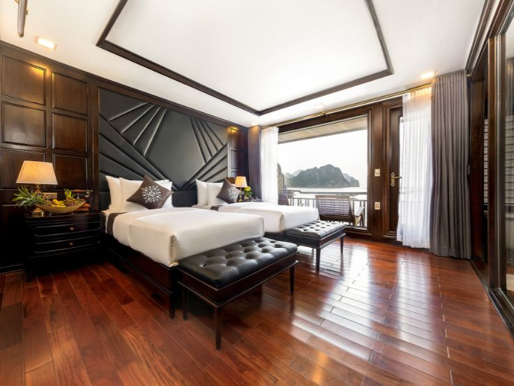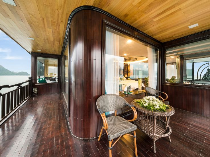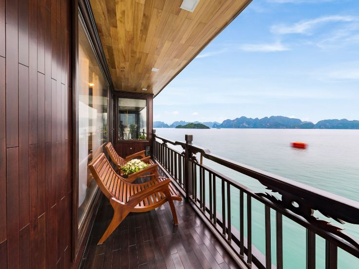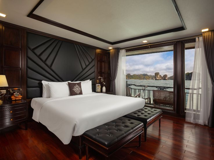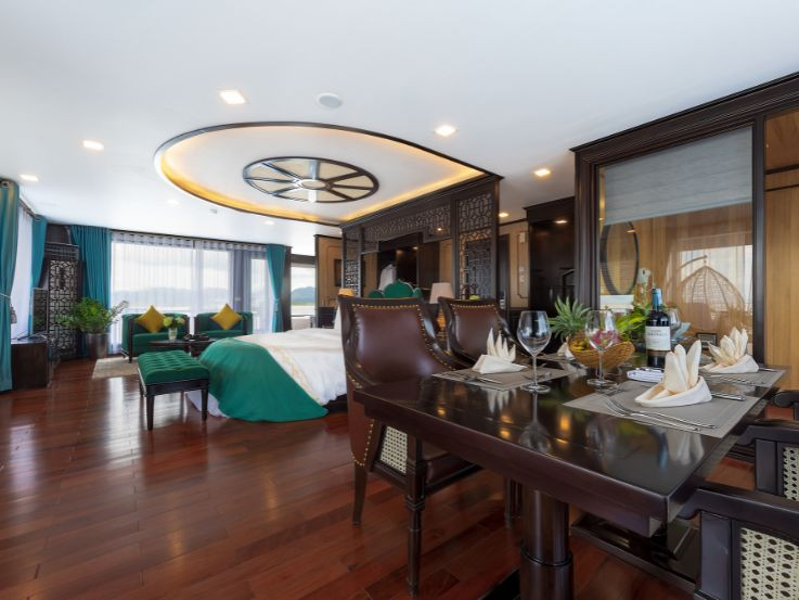 Located on a higher level, the Suite Ocean View on Mila Grand Cruises offers enhanced perspectives of the surrounding seascape. The cabin blends classic charm with modern comfort, creating a relaxing retreat after a day exploring the bay. It’s an excellent option for those seeking a more elevated Halong cruise experience.
