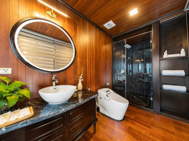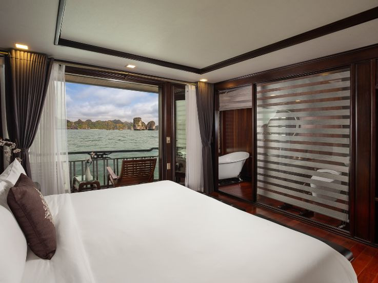 The Royal Suite Balcony on Mila Grand Cruises is the most premium accommodation onboard, featuring a private balcony that opens directly to the stunning views of Halong Bay. With elegant interiors, added space, and a luxurious bathtub, this suite creates a more exclusive and intimate Halong Bay cruise experience - perfect for couples or special occasions.