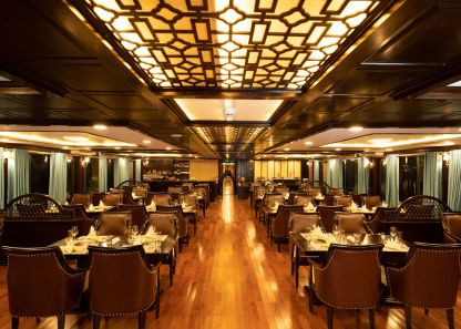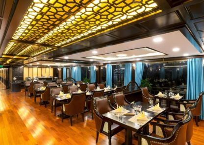 Wrapped in warm wooden tones and soft lighting, the restaurant offers a cozy yet refined setting that enhances every meal. Whether enjoying a quiet dinner or sharing laughter with loved ones, the atmosphere transforms simple moments into lasting memories during your Halong Bay overnight cruise.