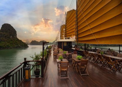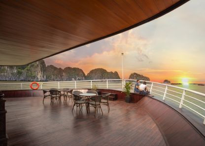 Perched above the water, the sundeck is where every moment feels cinematic. From golden sunsets painting the limestone peaks to quiet nights under a sky full of stars, this open-air space invites you to slow down and truly connect with the beauty of Halong Bay. It’s not just a place to relax - it’s where the essence of a Halong Bay cruise comes alive.
