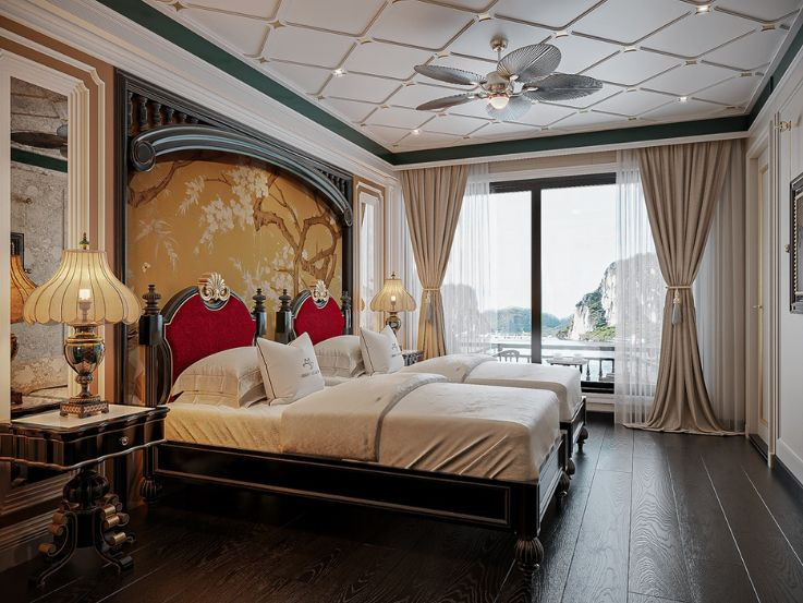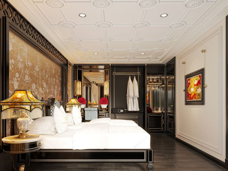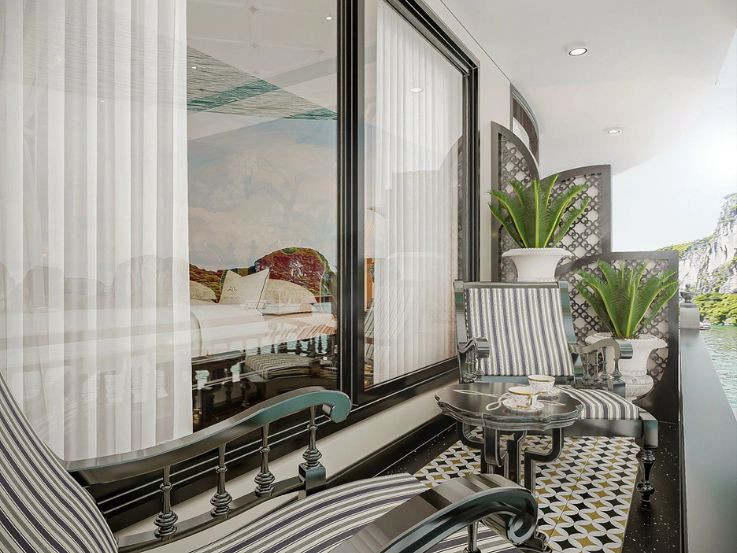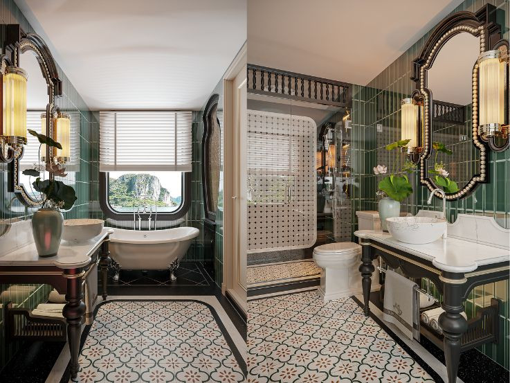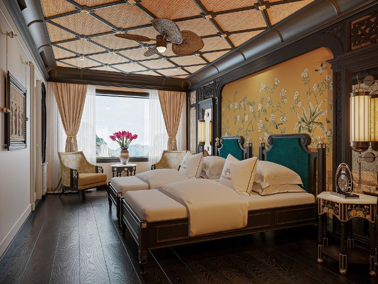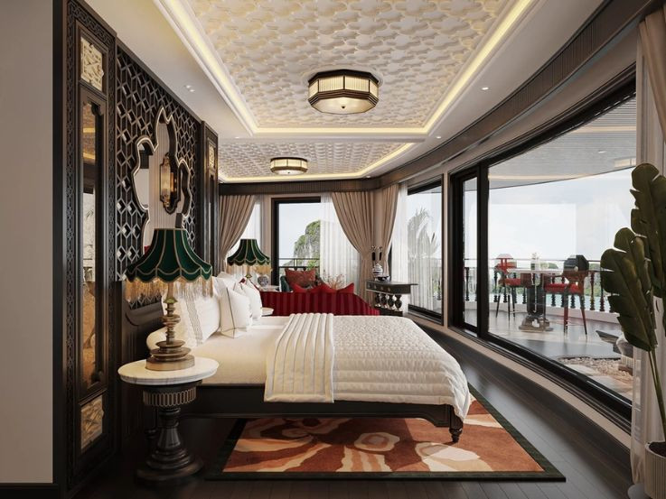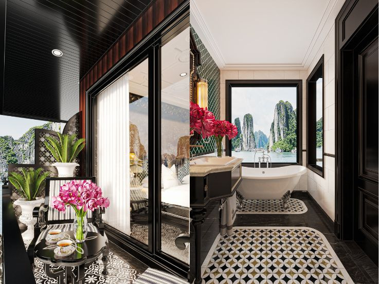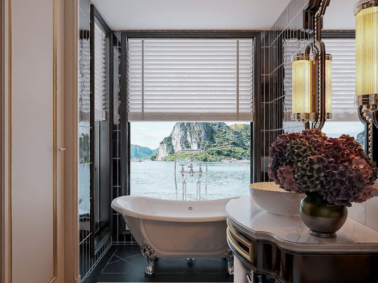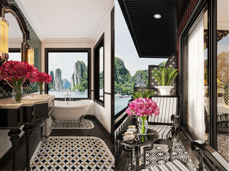 Located on the first deck, the Halong Deluxe is an invitation to tranquility. The interior features a palette of warm wood and classic Indochine patterns, reminiscent of a colonial-era boutique hotel. Though it features large panoramic windows instead of a balcony, the room is flooded with natural light. The highlight is the en-suite ocean-view bathtub, where guests can soak in luxury while watching the limestone karsts glide by.