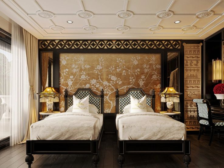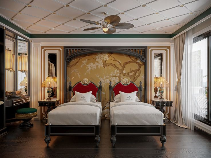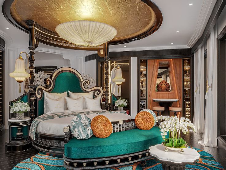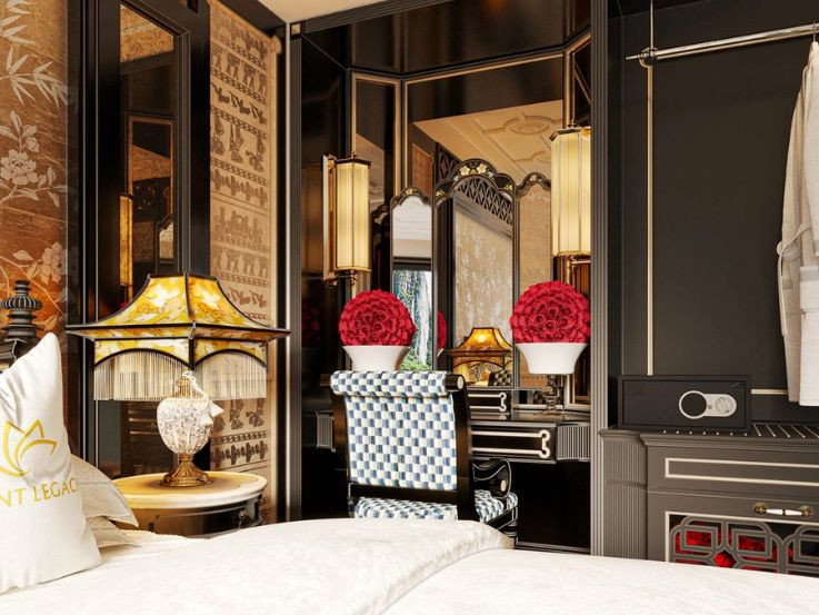 As the crown jewel and most prestigious cabin on the Orient Legacy, the Saigon Legacy spans a breathtaking 120 m2. Positioned at the bow (front) of the ship, it features a majestic 180-degree panoramic view through curved floor-to-ceiling glass. The interior is a cinematic masterpiece of Indochine opulence, featuring a massive private lounge, a super-king bed, and a lavish bathroom. Guests in this suite are treated like royalty, enjoying the most exclusive and grandest "Legacy" ever offered on the water.