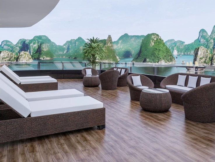 Positioned on the top deck, the expansive sundeck offers sweeping views of Lan Ha Bay. It is the ideal place to unwind, enjoy the sea breeze, and witness the breathtaking beauty of sunrise and sunset. Guests can relax on comfortable loungers and immerse themselves in the peaceful surroundings. A truly tranquil space to reflect and recharge.