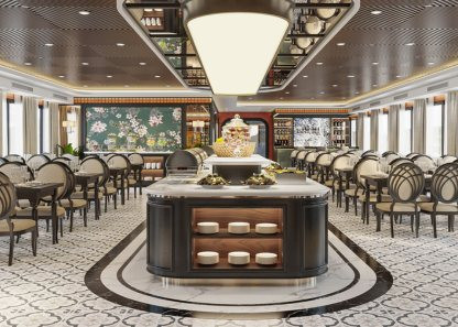 The ship’s restaurant delivers a fine dining experience in a beautifully appointed space. With tasteful décor, warm lighting, and attentive service, guests are invited to enjoy a variety of well-crafted dishes. Whether it is a romantic dinner or a group gathering, every meal becomes a highlight of the voyage.