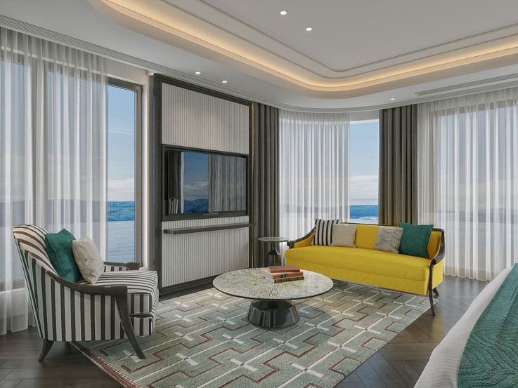 Designed for comfort and relaxation, the Diana Senior Balcony cabins feature full glass windows that flood the room with natural light and provide uninterrupted views of the surrounding bay. The interior blends modern design with warm tones, while the spacious bathroom includes a jacuzzi and a separate shower area.
