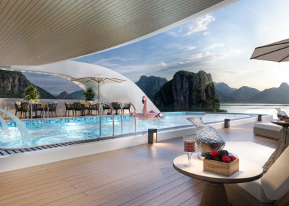 Imagine floating between the sky and the sea as you relax in the crystal-clear waters of the 50-m² infinity pool, one of the rarest facilities among Halong Bay luxury cruises. Using advanced ion salt technology instead of harsh chemicals, the pool provides a safe, eco-friendly, and luxurious bathing experience.