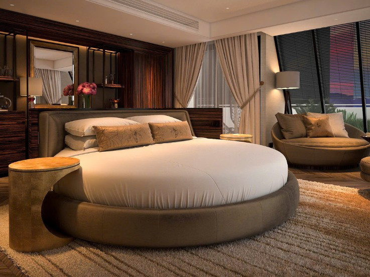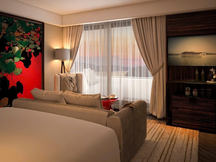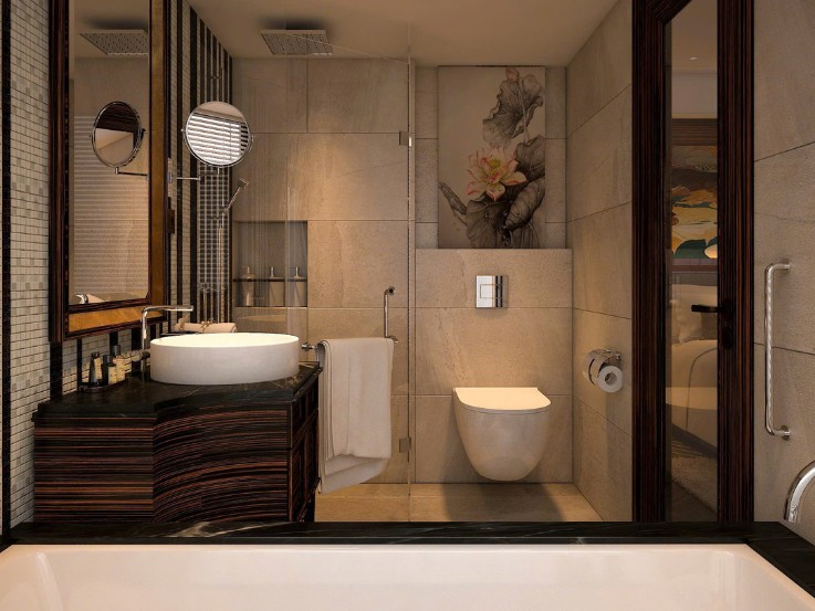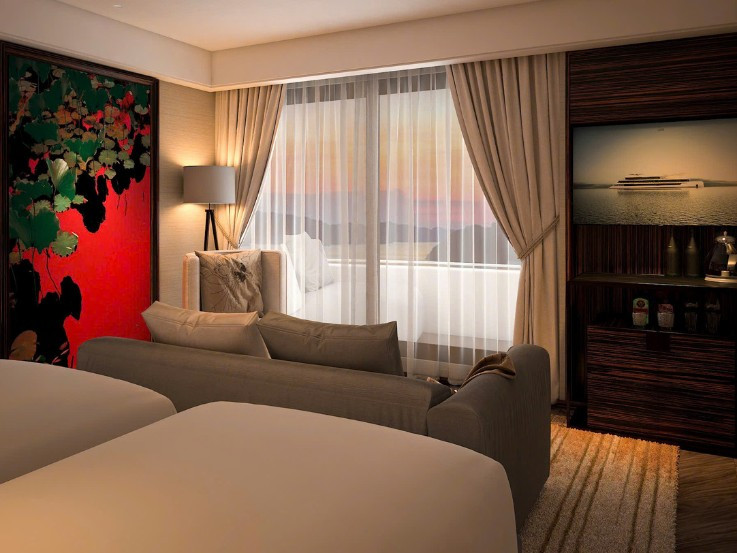 The Executive Suite elevates luxury with a spacious private terrace and exclusive sky jacuzzi. Designed with a sophisticated lotus-inspired concept, the room features premium materials, soft neutral tones, and artistic floral accents. Guests can unwind in total privacy while enjoying panoramic views for a romantic Halong cruise or honeymoon escape.