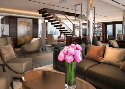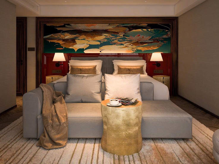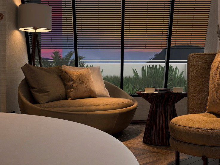 The Premier Connecting Suite is the most spacious family option onboard, offering two interconnected rooms with elevated positioning for better views. The design embraces the lotus theme through subtle decorative details, creating a peaceful and luxurious atmosphere.