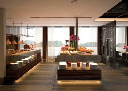 01:00 - 01:15 PM: Guests enjoy a delicious lunch in the restaurant while La SEN of the Bay sails past limestone islets, offering the first panoramic views of Ha Long Bay.